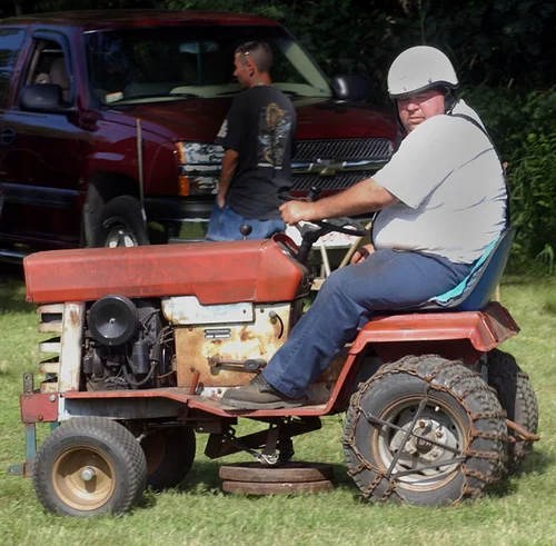 ca 1972, French Hill commune, St. Albans, communard in a mosquito headnet, driving a 1950's Oliver tractor borrowed from the Plouffe family in the house in the background.